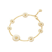 Sterling silver bracelet with 8 daisies in various sizes in 18ct gold plating and white enamel.