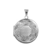 A large silver locket to wear a cherished image close to your heart decorated with a Celtic knot design.
