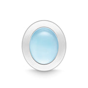 A large oval, smooth, cabochon blue topaz stone surrounded by a polished silver, rub-over setting.