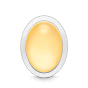 A large oval, smooth, cabochon citrine surrounded by a polished silver, rub-over setting.