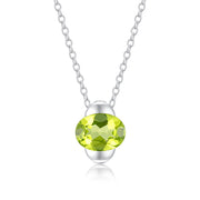 A pendant with a faceted peridot gently cocooned by sterling silver on a fine trace chain