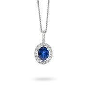 Set with a ravishing central oval sapphire surrounded by claw set brilliant cut diamonds.