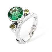Phoebe ring 9ct white gold Fluorite round faceted 10mm, 2 x peridot cabochon Tot 0.12ct N 1/2