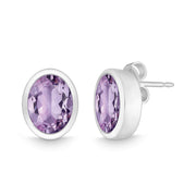 Amethyst stud earrings in a sterling silver. Generously-sized oval, faceted, bright stones.