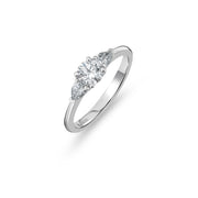 Our Radiant ring is a delicate 3 stone ring set here with an exceptional D Flawless brilliant cut diamond with 2 pear cut diamonds on the shoulders in Platinum.