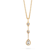 18ct yellow gold pendant and chain featuring a drop bar detail set with 2 brilliant cut and a pear cut diamond in rub over settings.